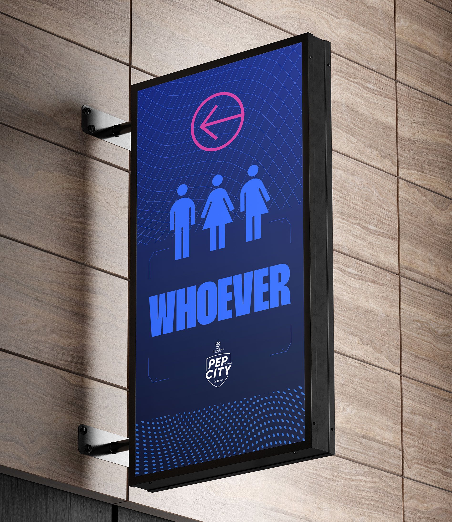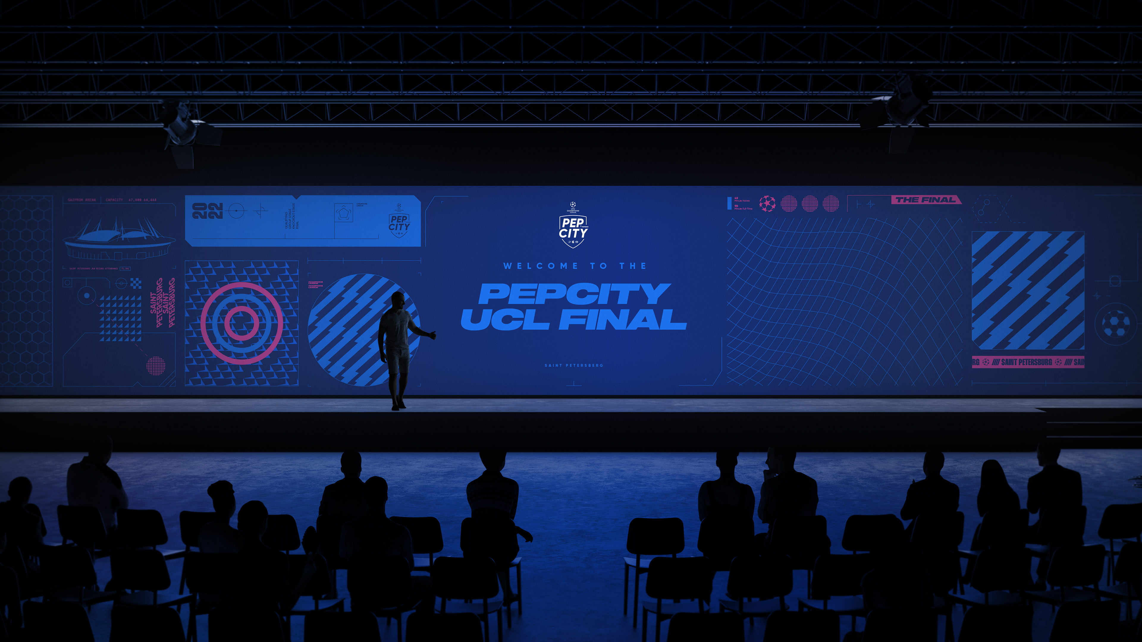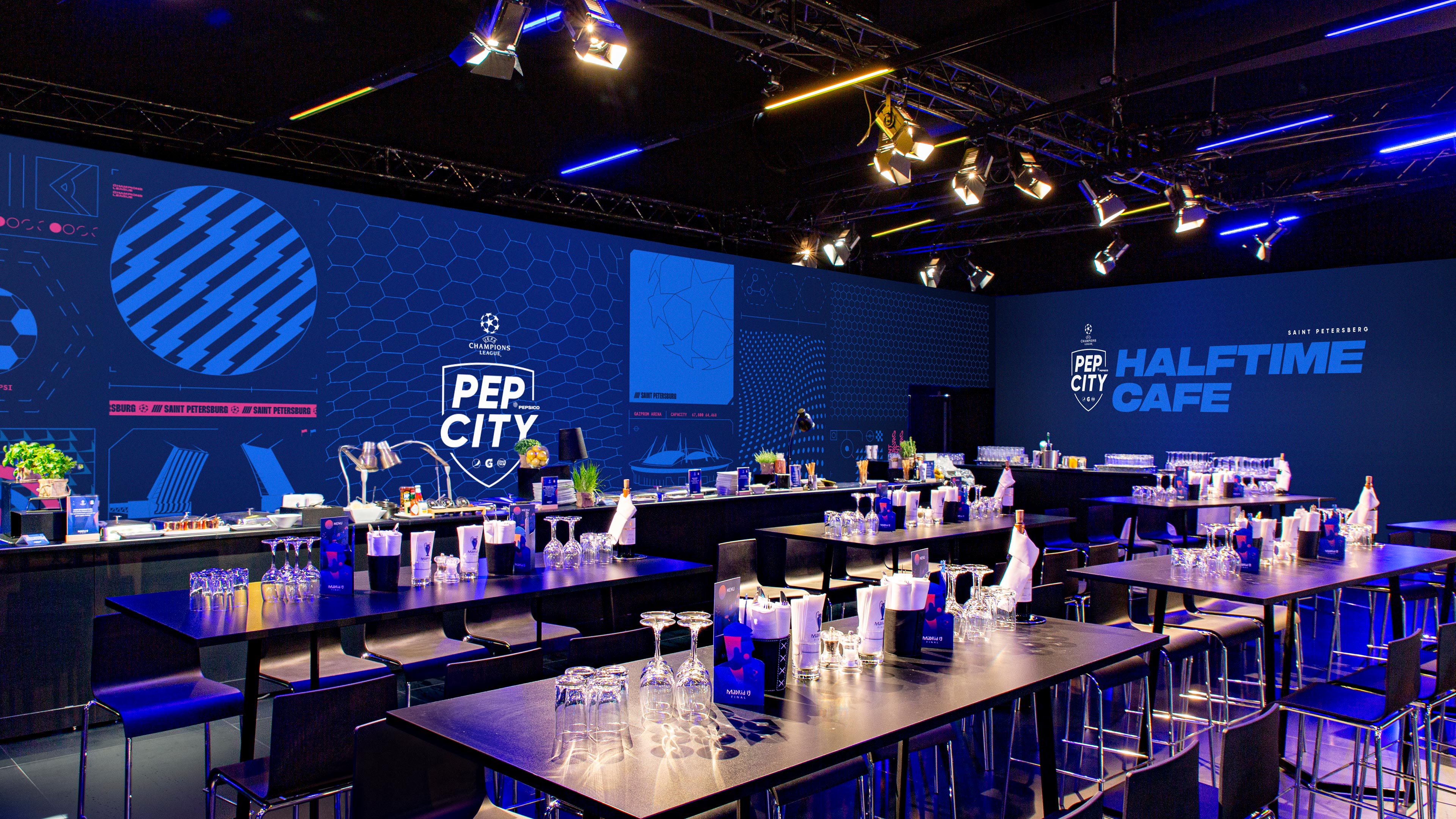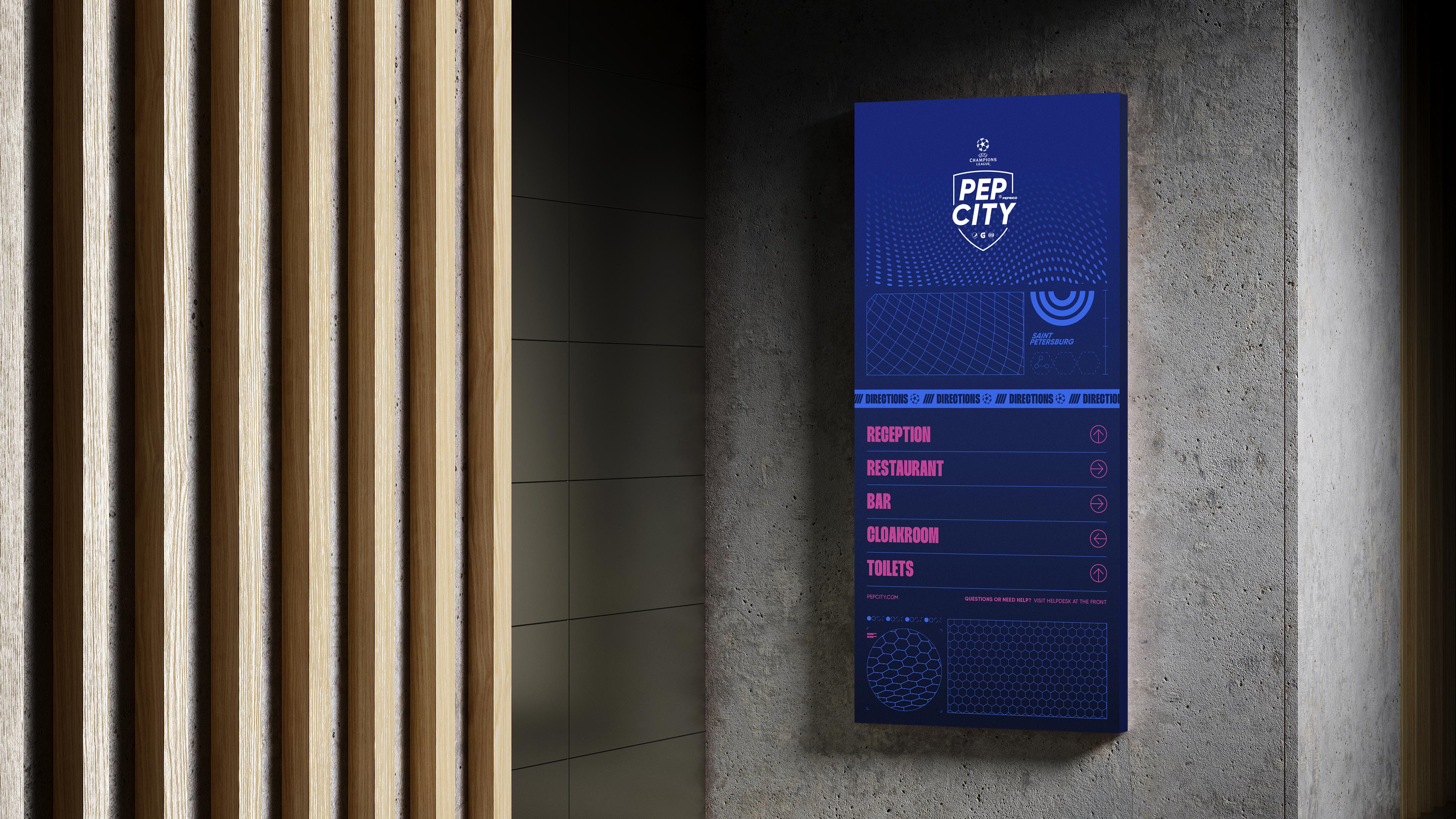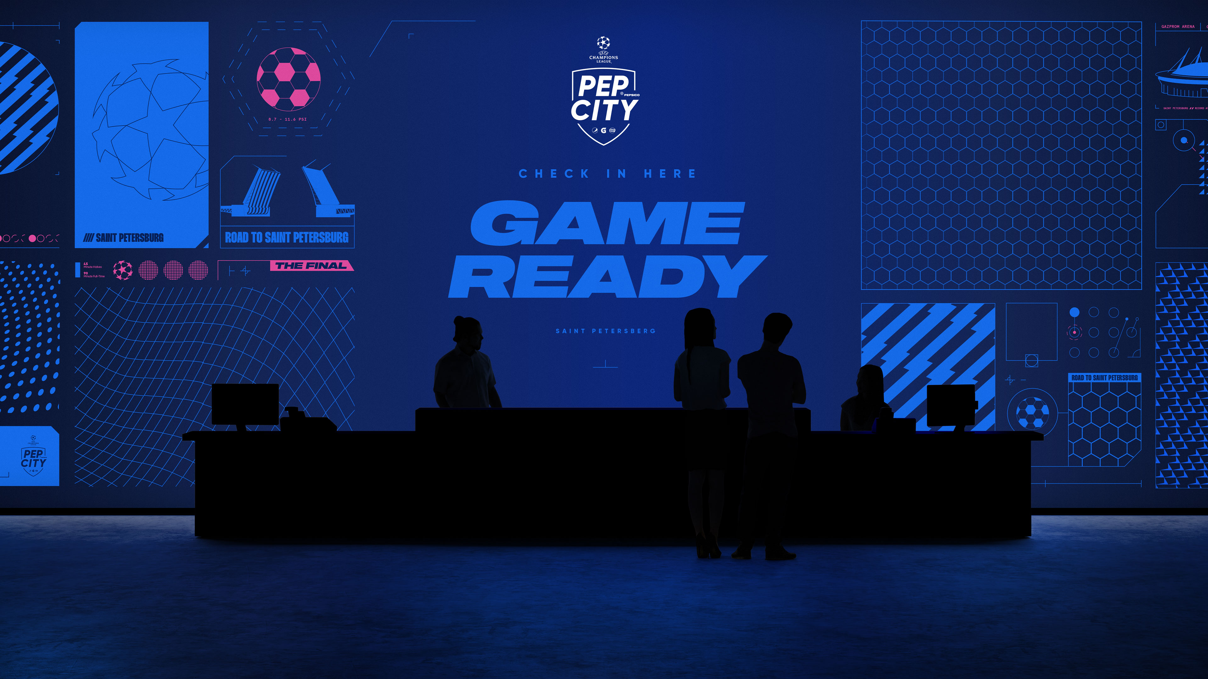 We were tasked to create a bold visual identity that could be used across the whole event, including all the large scale wall graphics, invitations, merchandise, social media and app design. Our graphic language needed to belong in the Pepsi world, whilst also having nods to football, and being flexible enough to use on both large and smaller items. Our solution was a gridded system that housed patterns and iconography inspired by the location and the Champions League, along with detailed guidelines to be supplied to the event production team.